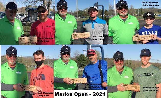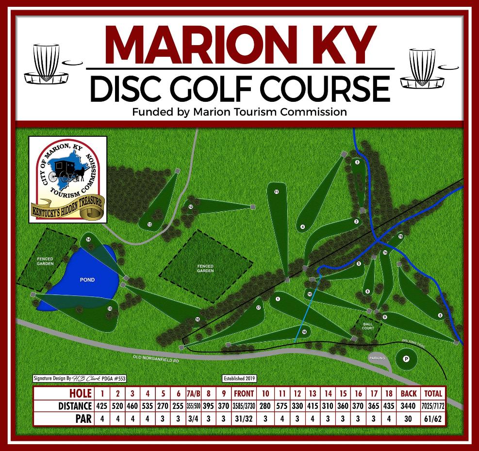 2nd Annual Marion Disc Golf Open Presented by Marion Tourism and Bluegrass Disc Golf PDGA B-tier event! APRIL 3, 2021 Two rounds of 18 holes on the course (special player social distancing conditions include tee times) Register Early to hold your spot! Course OB sheet to be emailed to all players. Also posted on PDGA/score app. Live on line hole by hole scoring with PDGA/score used in all groups. Keep 6' from other players and staff. Register here on Disc Golf United Pre-registration only. 90 player limit! Wail list establised to add if ther are drops Tee times will be assigned with players playing in their own divisions Tee times posted Friday evening after registration closes. First tee time starts at 8:00 am for round 1. First tee time for round 2 starts at 12:00 noon. Players will stay in their group for each round. Pro Divisions: $55 (100%+ cash payback + $750 added cash!) All Amateur divisions entry $35. All Amateurs recieve a players package: custom Innova Disc and custom towel Amateur payout payout to top 45% (on site or on line) Advanced Divisions (includes age protected) Intermediate Divisions Recreational Divisions Novice Divisions Junior Divisions Non-PDGA members in above divisions pay additional $10 Amateur prizes will be online gift codes through Disc Golf United pro shop, or from limited stock set up on site (or split). Pro checks available on site or on line pay pal (goods and services). Trophies for first place in divisions with over 5 players (as of 3/15/21). |