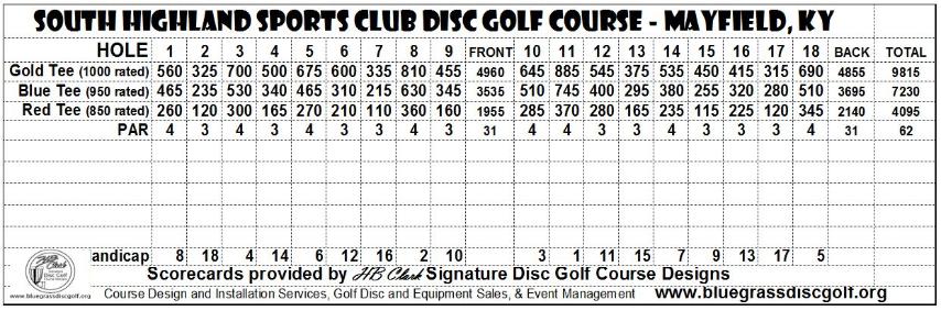 | South Highland Sports Club Disc Golf Course 3313 State Route #303 • 270-247-2918 Mayfield, KY |